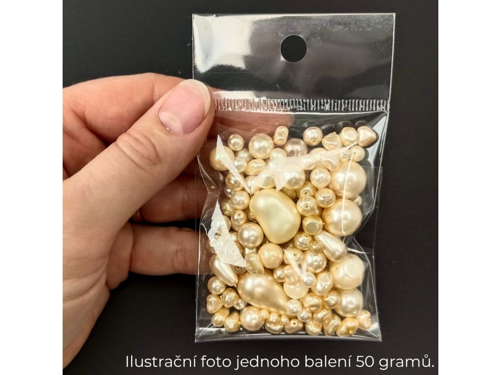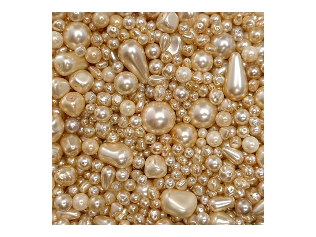 Mix českých skleněných voskovaných perel, kde jsou převážně kulaté korálky. Může obsahovat také kapky, hrušky, kostičky, olivky či jiné tvary. Velikost korálků je v rozmezí 2 až 18 mm.