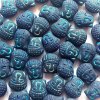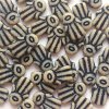 Skleněný mačkaný korálek z dílny Rutkovsky ve tvaru kolečka s motivem kormidla. Znak kormidla a kraje korálku jsou opatřeny povrchovou úpravou, plocha je z leštěného barevného skla.